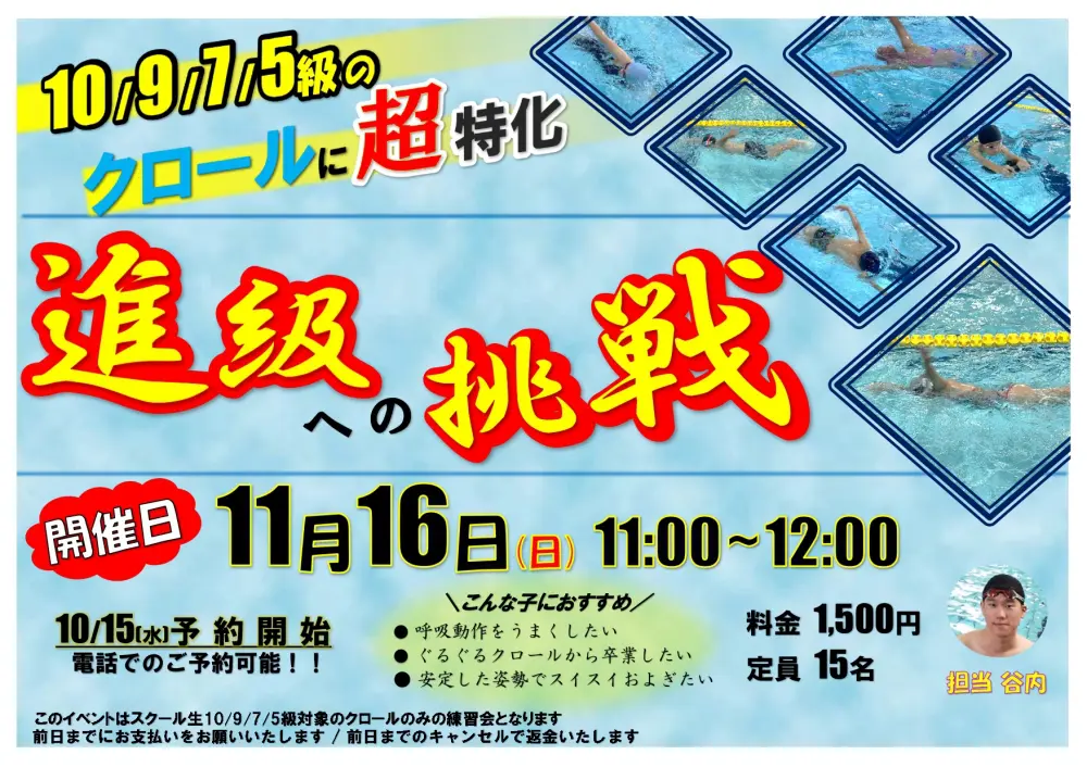 今回の進級への近道はクロールを重点的に行います!ここで正しいクロール、呼吸法を身に着けよう! ※5級の平泳ぎは行いません。